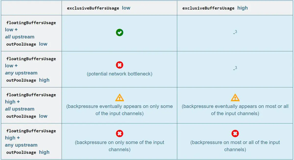 ① floatingBuffersUsage 为高则表明反压正在传导至上游。