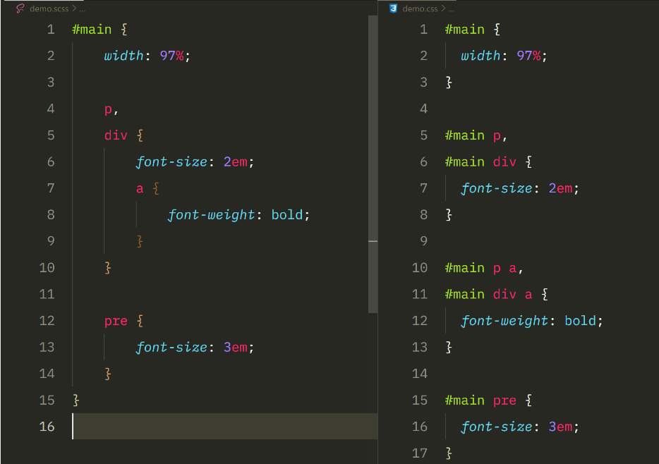 编译后的CSS文件中 & 将被替换成嵌套外层的父选择器,如果含有多层嵌套,最外层的父选择器会一层一层向下传递