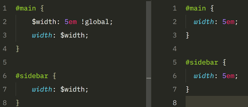 变量支持块级作用域,嵌套规则内定义的变量只能在嵌套规则内使用(局部变量),不在嵌套规则内定义的变量则可以在任意地方使用(全局变量)