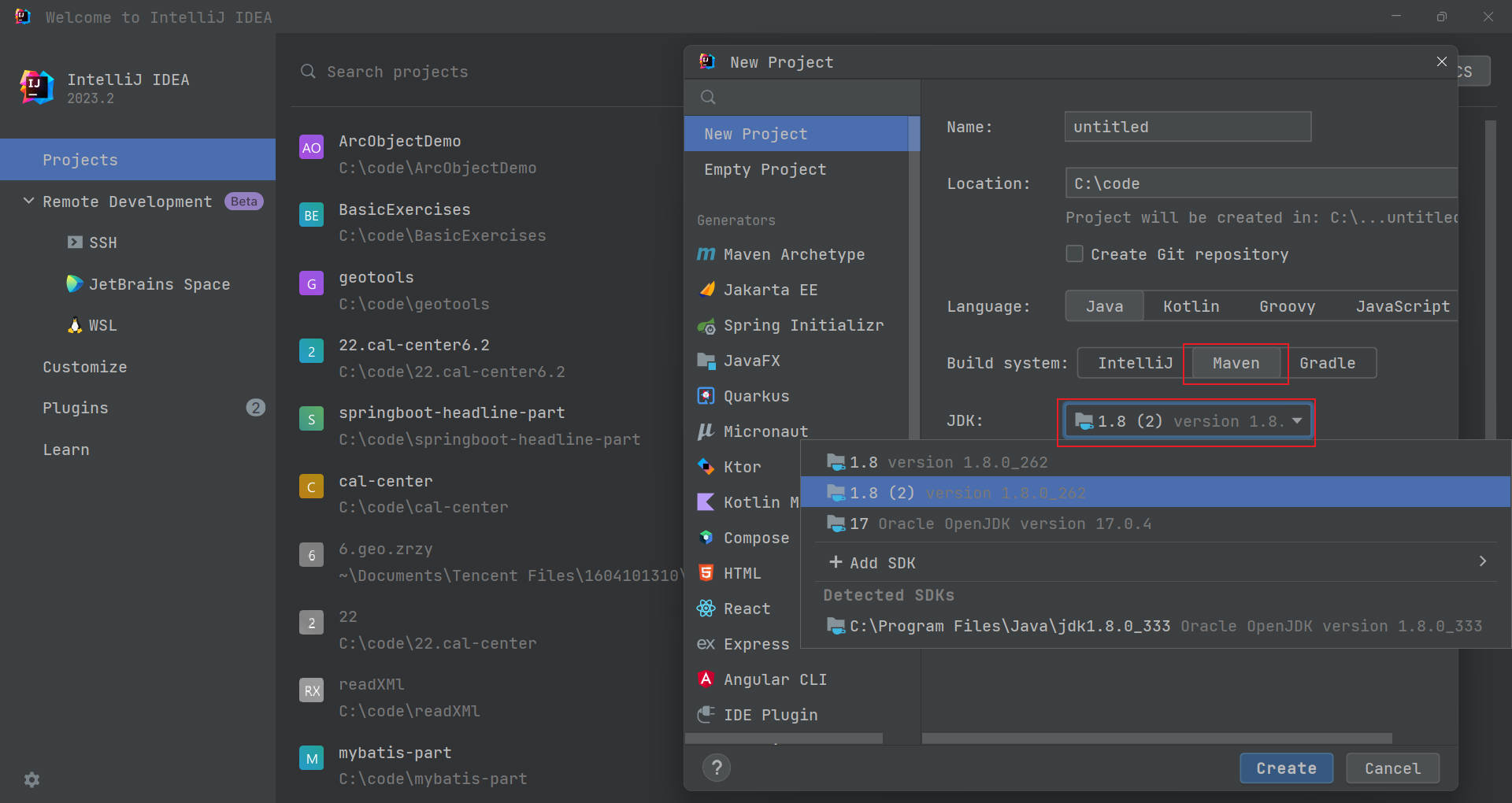 1.idea新建项目,选择Maven项目,JDK选择32位的jdk8u262-b10