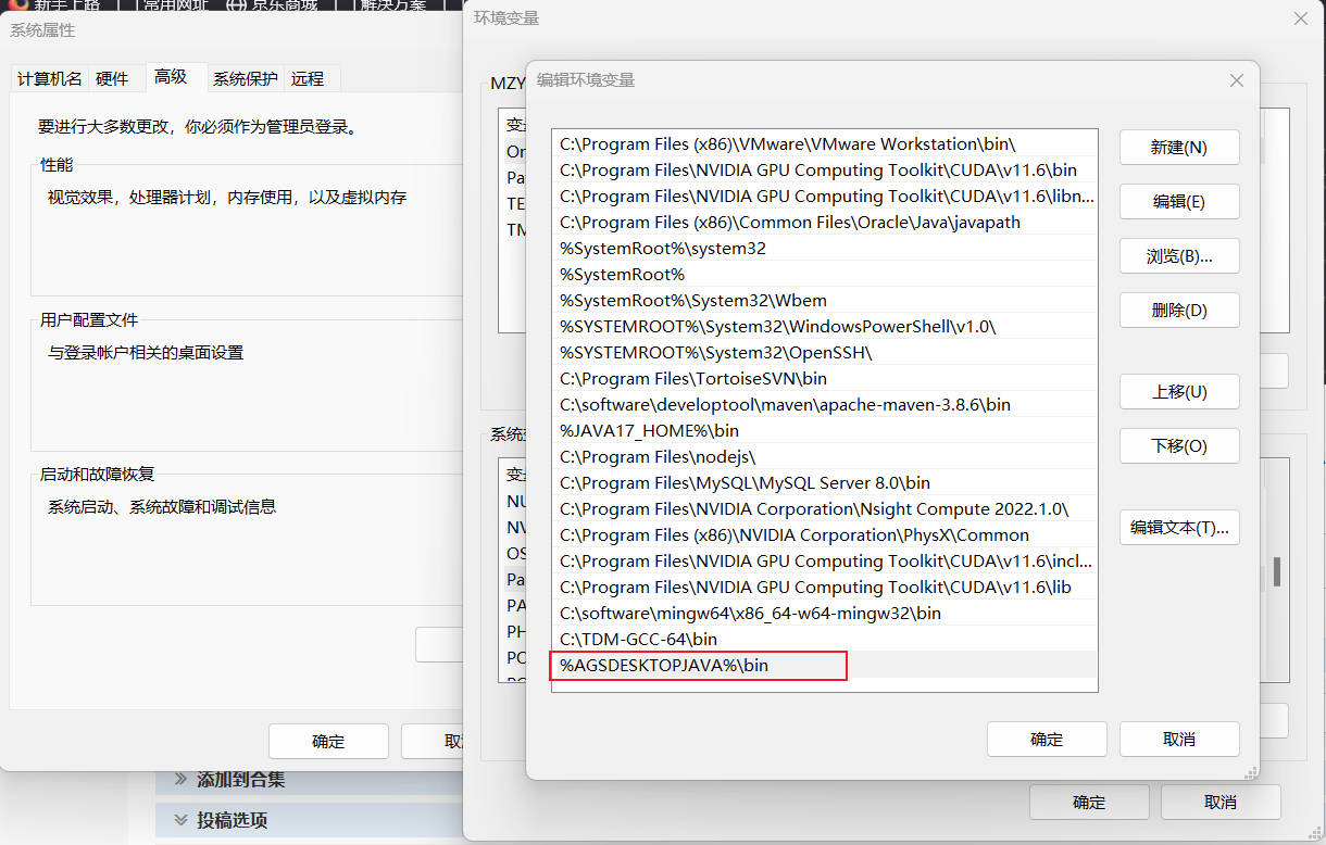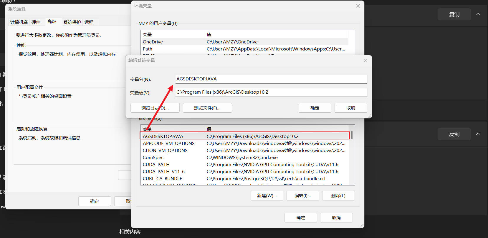 2.添加环境变量,将AGSDESKTOPJAVA加入到系统环境变量,路径为安装ArcGIS Desktop10.2的目录 **\ArcGIS\Desktop10.2,然后在Path系统变量中添加%AGSDESKTOPJAVA%\bin(类似Java环境变量的添加)
