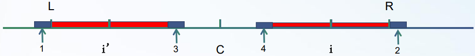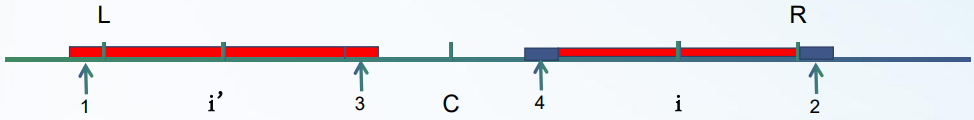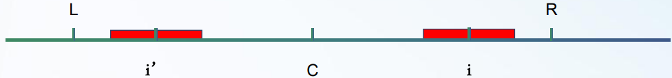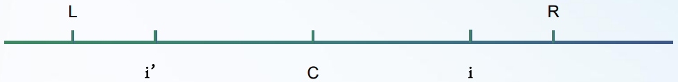 若 \(i\le R\),我们发现,\(i'\) 的回文区域是我们已经求过的,于是我们就可以加速处理,放一张图: