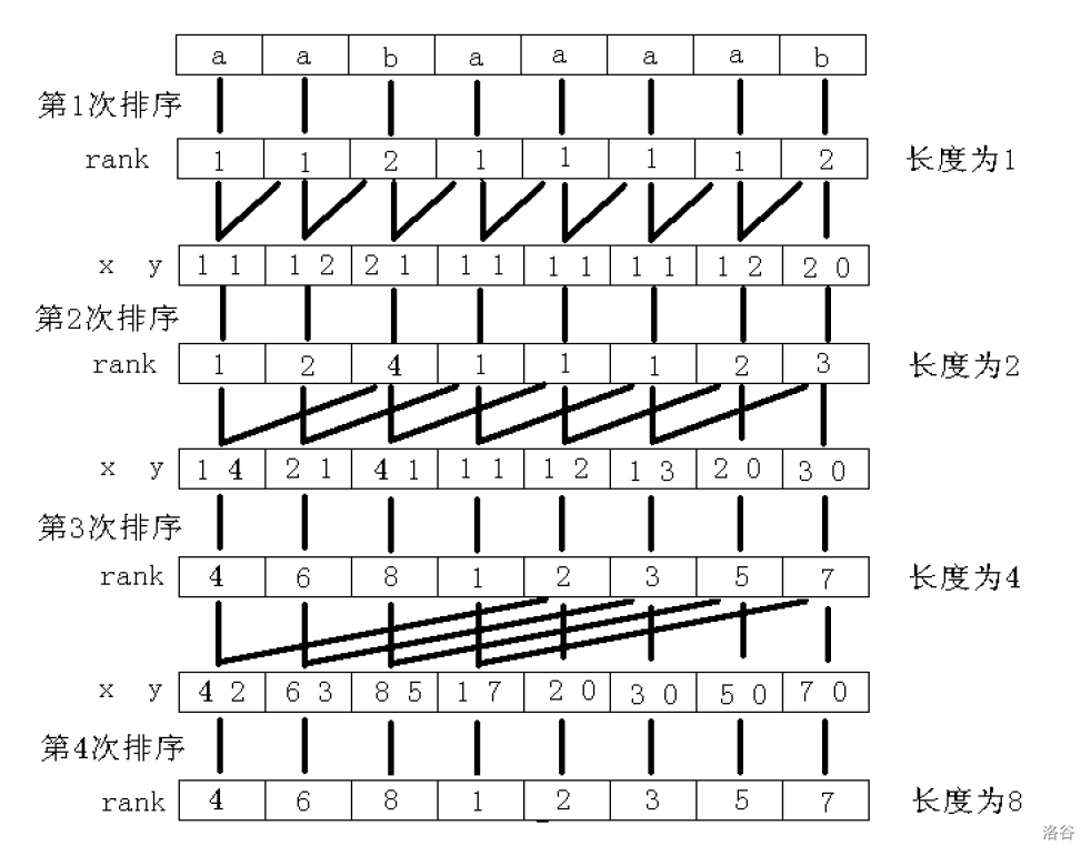 下面我们设 \(sa_i\) 表示将后缀排序后第 \(i\) 小的后缀开头的字符位置,\(rk_i\) 表示后缀 \(S_i\)(表示以 \(i\) 开头的后缀)的排名。