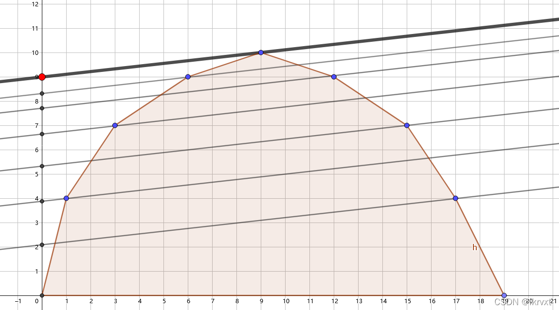 那么二分时,我们需要 check 什么呢?显然,我们需要找到最先切到的点。观察这条直线切每一个点的图像,我们发现:截距(与 \(y\) 轴的交点)最大的一条就是最先切到的一条。