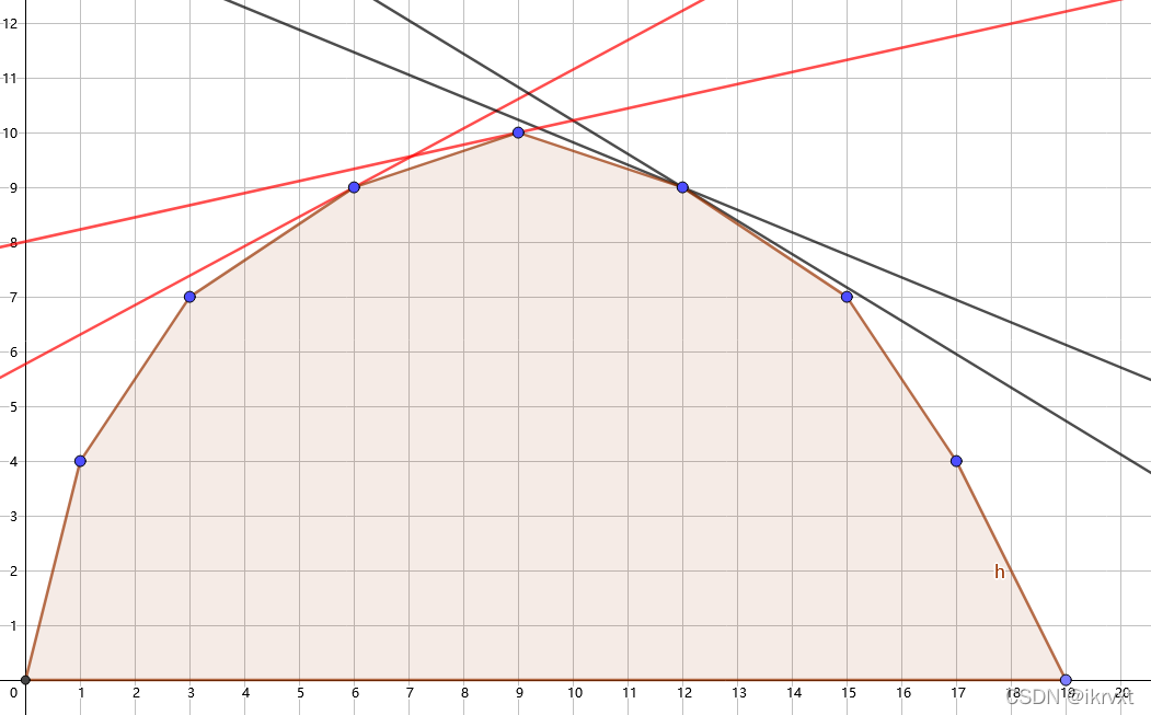 使用它有一个条件:假设选择 \(i\) 个物品的最大权值为 \(f(i)\),需要 \((i,f(i))\) 形成的图形是一个凸包。如下图(此图片及以下图片均来自此处,侵删):