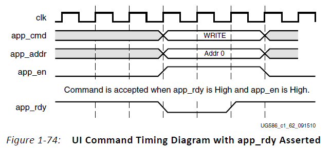 “写命令通道”主要有app_en, app_rdy, app_addr三个信号。当app_en & app_rdy为高时,命令被接收 (此时的app_addr成为有效的写地址)。
