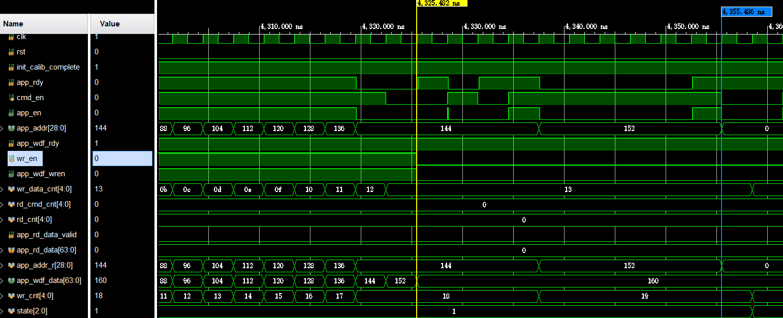 即:写数据可以在命令前、命令时、命令后放置,且命令后至多延迟两个周期就要放上数据。但官方配图容易给人造成误解,即:数据不得超前命令超过1个周期。调试过程中发现,数据实际可以超前命令很多个周期的!这一点需要注意。(如下图,在WR0状态中,第20个app_en & app_rdy在4355.486ns出现,但第20个app_wdf_wren & app_wdf_rdy在4325.482ns就出现了,后续测试表明,数据依然成功写入DDR)