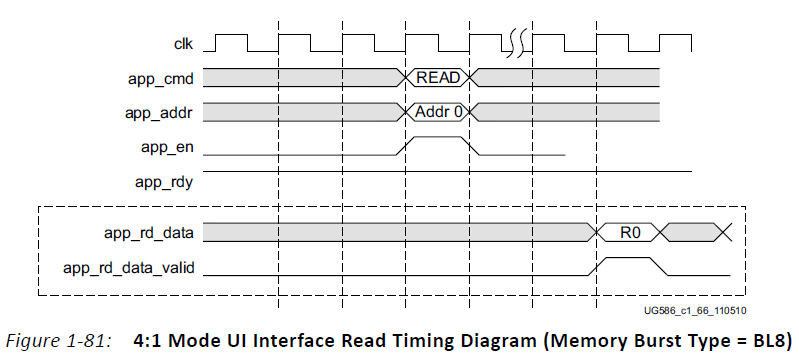 “读命令通道”主要有app_en, app_rdy, app_addr三个信号(与"写命令通道"的区分由app_cmd完成,app_cmd = 3'b000时为写,app_cmd = 3'b001时为读)。当app_en & app_rdy为高时,命令被接收 (此时的app_addr成为有效的读地址)。