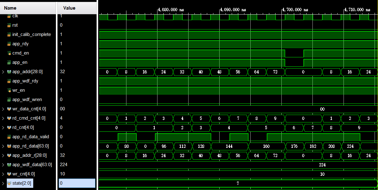 关键问题4:app_wdf_wren的及时拉低。由于写命令通道和写数据通道的分离,编写代码时应尤其注意app_wdf_wren信号的及时拉低。否则,即使在app_cmd反复切换数次之后,仍可能通过后续app_en的拉高写入大量垃圾数据,影响调试。(典型垃圾数据为0或原有效数据的继续自增)
