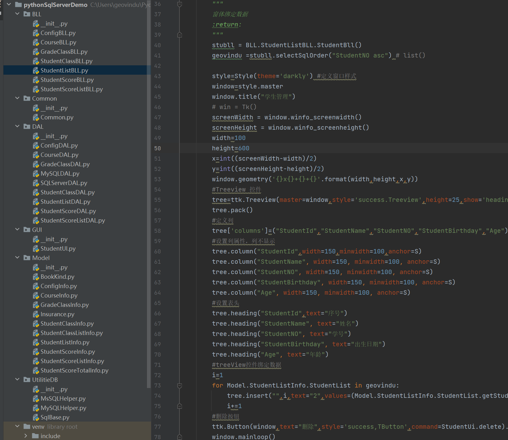 """ StudentUI.py 读文件类 date 2023-06-24 edit: Geovin Du,geovindu, 涂聚文 ide: PyCharm 2023.1 python 11 """ import datetime import sys import os from tkinter import ttk from tkinter import * from tkinter.ttk import * from ttkbootstrap import Style # pip install ttkbootstrap import random import Model.StudentListInfo class StudentUi(object): global tree def __del__(self): self.name="geovindu" def delete(): global tree tree.delete(tree.selection()) def main(): geovindu = list() geovindu.append(Model.StudentListInfo.StudentList(1, '王二', '002', datetime.datetime(2008, 2, 14, 0, 0))) geovindu.append(Model.StudentListInfo.StudentList(2, '涂年生', '003', datetime.datetime(2008, 2, 14, 0, 0))) geovindu.append(Model.StudentListInfo.StudentList(3, '涂聚文', '004', datetime.datetime(2008, 2, 14, 0, 0))) geovindu.append(Model.StudentListInfo.StudentList(4, '赵三', '001', datetime.datetime(2008, 2, 14, 0, 0))) geovindu.append(Model.StudentListInfo.StudentList(5, '李四', '005', datetime.datetime(2008, 2, 14, 0, 0))) style=Style(theme='darkly') #定义窗口样式 window=style.master window.title("学生管理") # win = Tk() screenWidth = window.winfo_screenwidth() screenHeight = window.winfo_screenheight() width=100 height=600 x=int((screenWidth-width)/2) y=int((screenHeight-height)/2) window.geometry('{}x{}+{}+{}'.format(width,height,x,y)) #Treeview 控件 tree=ttk.Treeview(master=window,style='success.Treeview',height=25,show='headings') tree.pack() #定义列 tree['columns']=("StudentId","StudentName","StudentNO","StudentBirthday") #设置列属性,列不显示 tree.column("StudentId",width=150,minwidth=100,anchor=S) tree.column("StudentName", width=150, minwidth=100, anchor=S) tree.column("StudentNO", width=150, minwidth=100, anchor=S) tree.column("StudentBirthday", width=150, minwidth=100, anchor=S) #设置表头 tree.heading("StudentId",text="序号") tree.heading("StudentName", text="姓名") tree.heading("StudentNO", text="学号") tree.heading("StudentBirthday", text="出生日期") #treeView控件绑定数据 i=1 for Model.StudentListInfo.StudentList in geovindu: tree.insert("",i,text="2",values=(Model.StudentListInfo.StudentList.getStudentId(),Model.StudentListInfo.StudentList.getStudentName(),Model.StudentListInfo.StudentList.getStudentNO(),Model.StudentListInfo.StudentList.getStudentBirthday())) i+=1 #删除按钮 ttk.Button(window,text="del",style='success,TButton',command=StudentUi.delete).pack(side='left',padx=5,pady=10) window.mainloop()