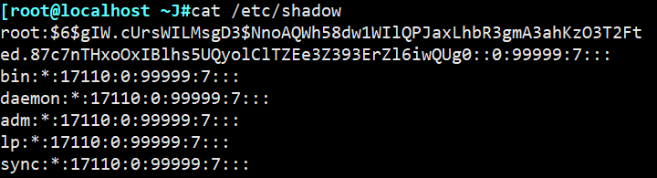 第二字段 $6$ecTCtoav.zKyqhFm$dhf49flxKxTiPFBSE34yyYVoM8NMiPNEqX3eyPtBurb2/66fUgutxBlWhG4qPhepV9Ih3jvVduYEY5Ec4KqkS0:密码加密值,当为*或!时表示用户不能登陆,当为空时可以不用密码直接登陆
