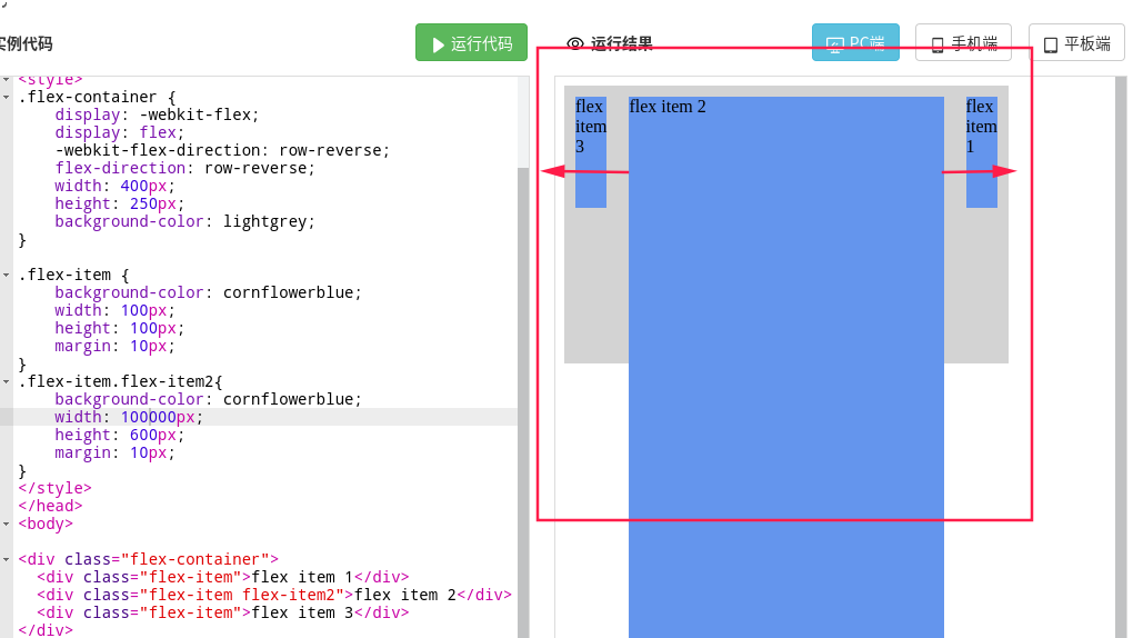 弹性盒子,顾名思义,它是有弹性的。设置flex-direction,事实上可以设置它的弹性方向,如果是row,那么每个项都在一个列上,那么每个列都有一个项,它就会在一行展示了。这种时候,设置弹性项的宽度,它会尽量去满足这种宽度,即使不惜压缩身边的兄弟弹性项。