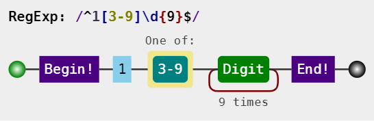- 手机号第一位必须为 1, 第二位 3-9 的数字, 其后跟随 9 个数字