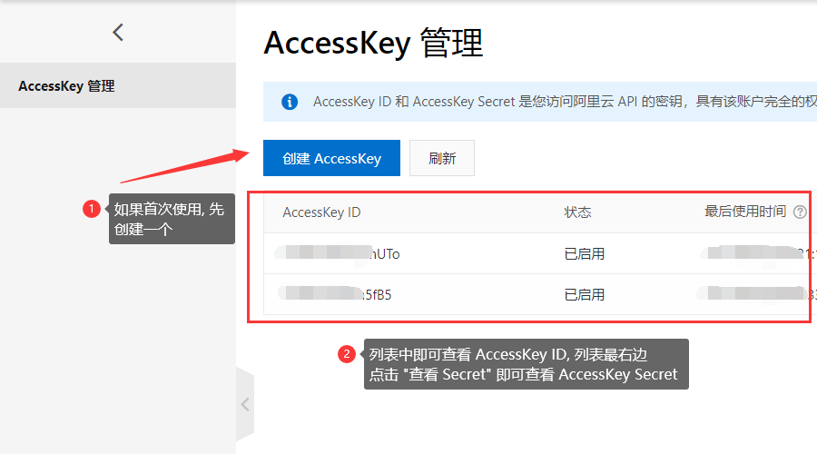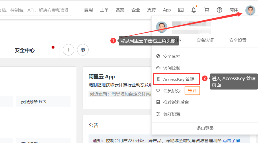 1.登录阿里云, 获取 AccessKey ID/AccessKey Secret
