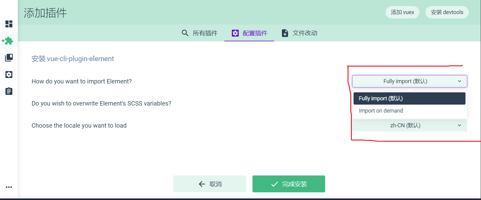它默认是全部导入的,选择important on demand这个选项就会配置相关的文件,之后你的项目中src文件夹下面多一个叫plugins的文件夹