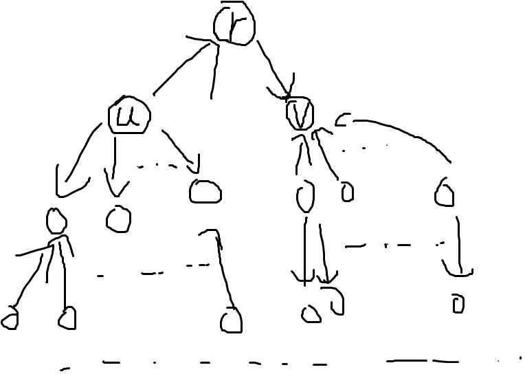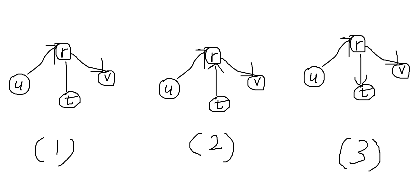 假设我们修改之后得到了一条长度为 \(2\) 的路径 \(u \to r \to v\)。如果 存在另一条树边 \((r,t)\),其中 \(t \neq u,t \neq v\),如下图 (1):