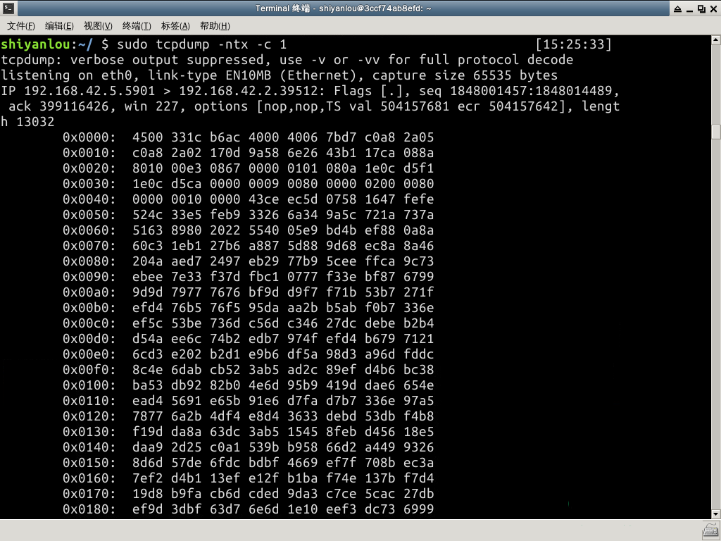 此时还没有数据包信息新开一个标签,执行以下命令,就能看到输出: