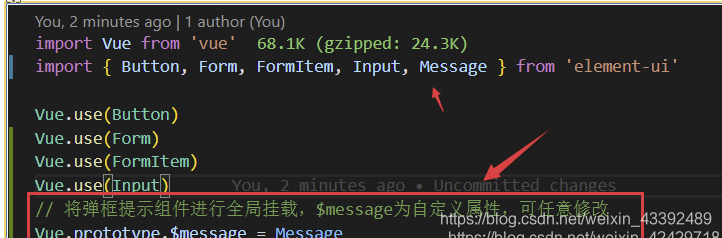 首先,在 element.js 中导入弹框提示组件,但是它的配置与其它组件不一样,它需要进行全局挂载。