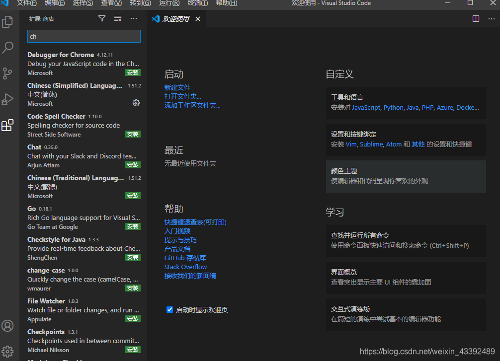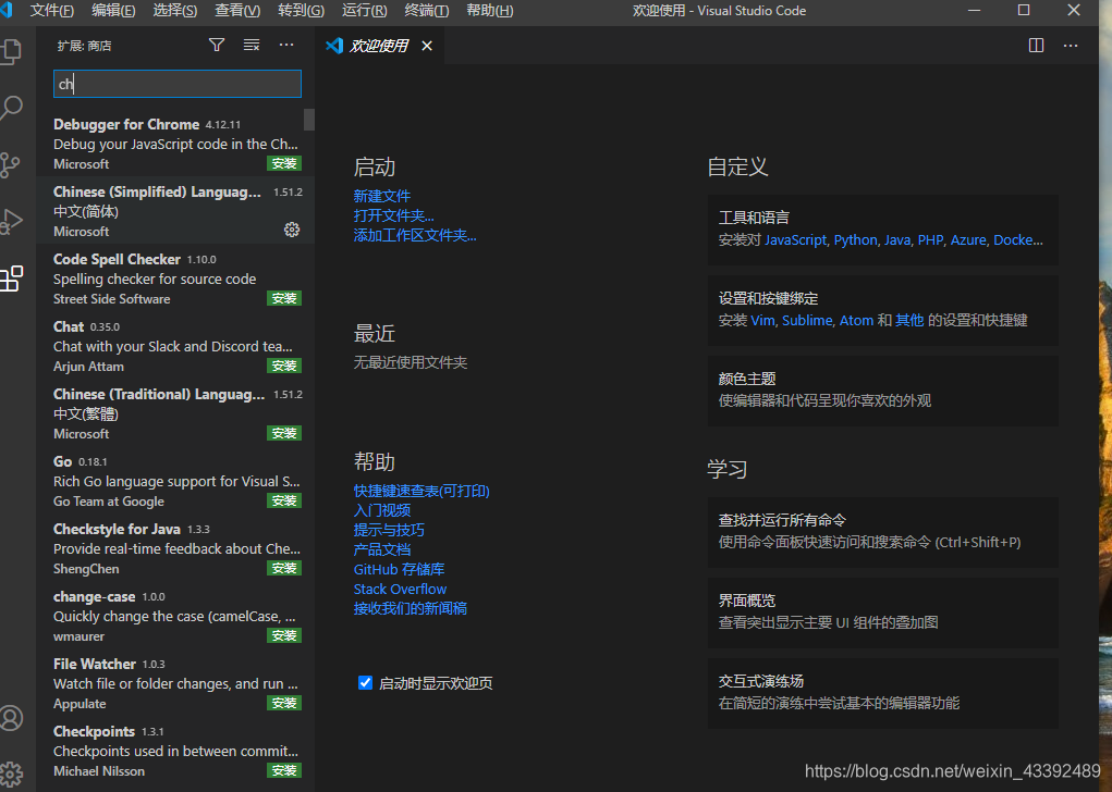 点击左侧工具栏的extensions或者使用快捷键【Ctrl+Shift+X】,输入chinese,点击Install安装中文简体