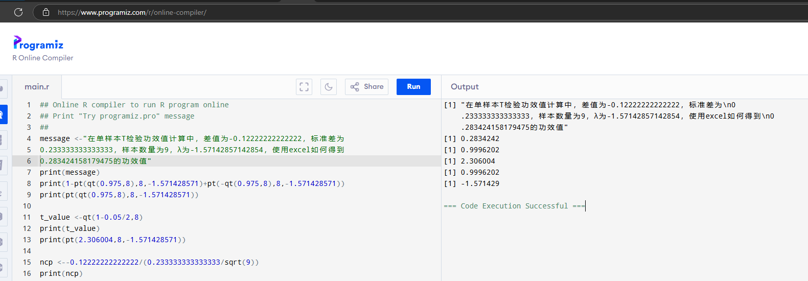 微信群中发现有对数理统计中单样本 T 检验功效值计算的讨论,在 R 语言中 1-pt(qt(0.975,8),8,-1.571428571)+pt(-qt(0.975,8),8,-1.571428571) 得到 0.2834242。