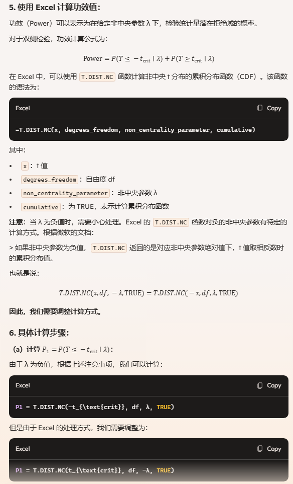 计算功效过程中用到了的非中心 t 分布,而 excel 原生没有对其支持,需要写自定义函数,