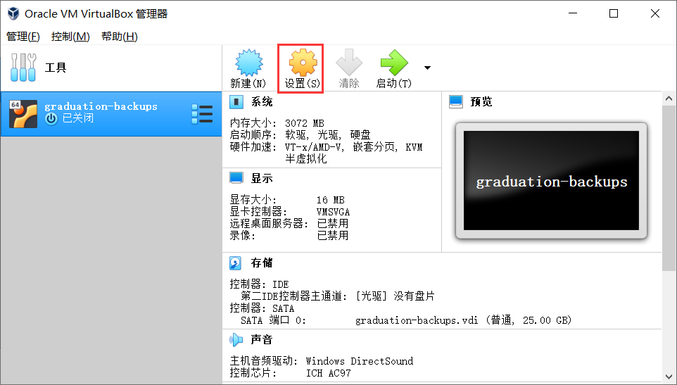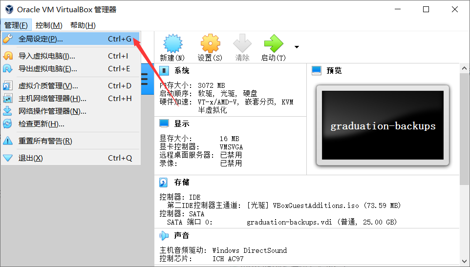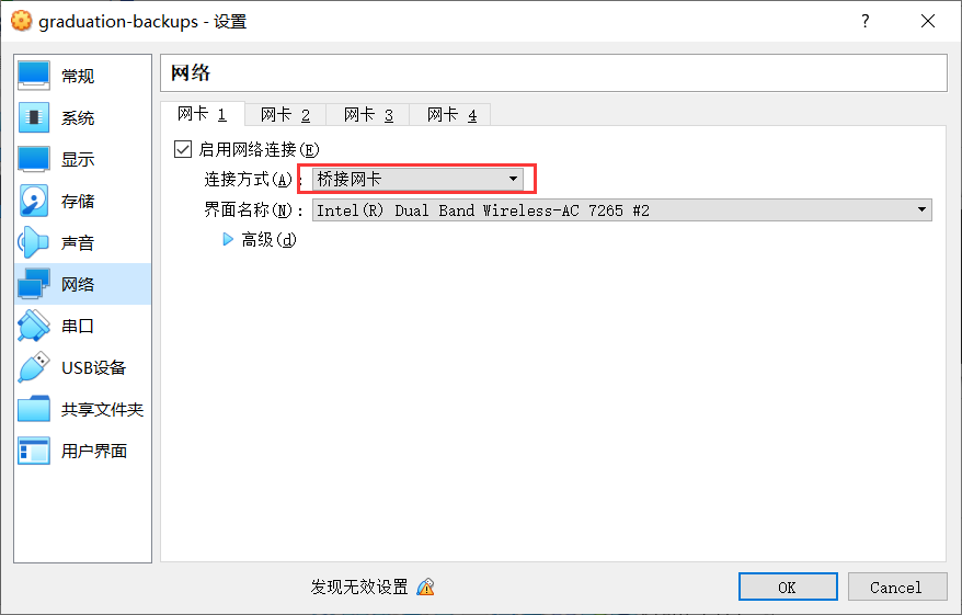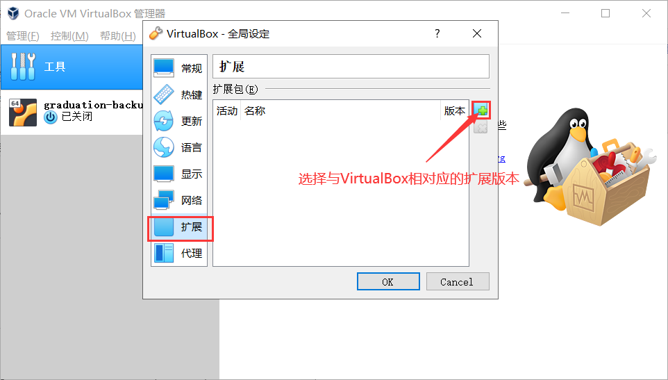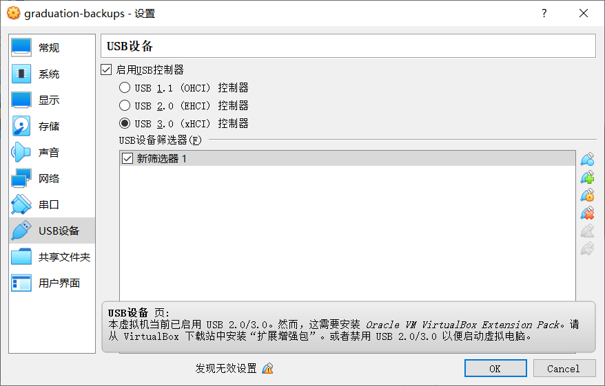 如下图所示出现无效设置,提示说需要安装VirtualBox的扩展包
