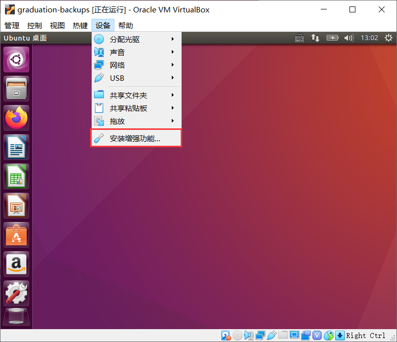 1、安装增强功能,方便文件的传输以及共享粘贴板。步骤如下: