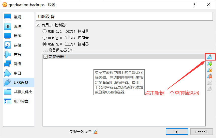 3、配置USB接口通信,选择USB3.0,并新键一个新的筛选器。否则会识别不出3.0的usb接口。