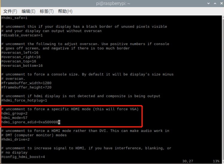 hdmi_group=2 //表示计算机显示器使用的分辨率 hdmi_mode=57 //hdmi_mode=57表示分辨率为 1680x1050 reduced blanking hdmi_ignore_edid=0xa500080 //如果不加,树莓派可能仍会“自作聪明”的检测HDMI设备的分辨率,结果造成我们设置的分辨率无效。