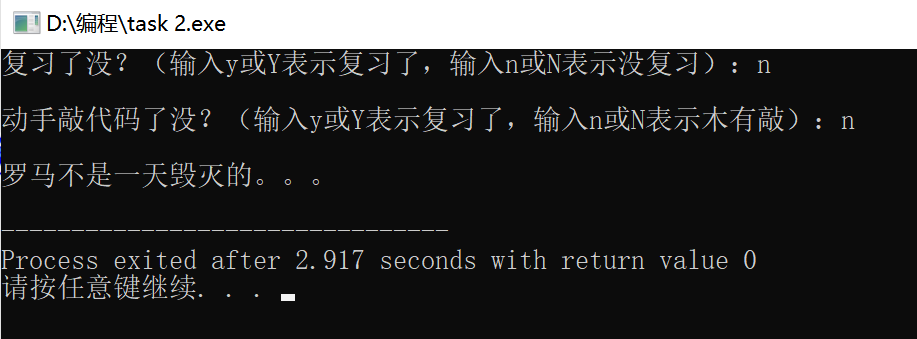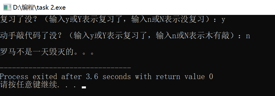 #include<stdio.h> int main() { char ans1,ans2; printf("复习了没?(输入y或Y表示复习了,输入n或N表示没复习):"); ans1 = getchar(); getchar(); printf("\n动手敲代码了没?(输入y或Y表示复习了,输入n或N表示木有敲):"); ans2 = getchar(); if((ans1=='y'||ans1=='Y')&&(ans2=='y'||ans2=='Y')){ printf("\n罗马不是一天建成的:)"); } else{ printf("\n罗马不是一天毁灭的。。。\n"); } return 0; }