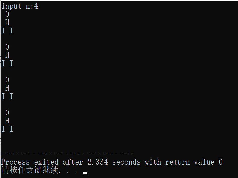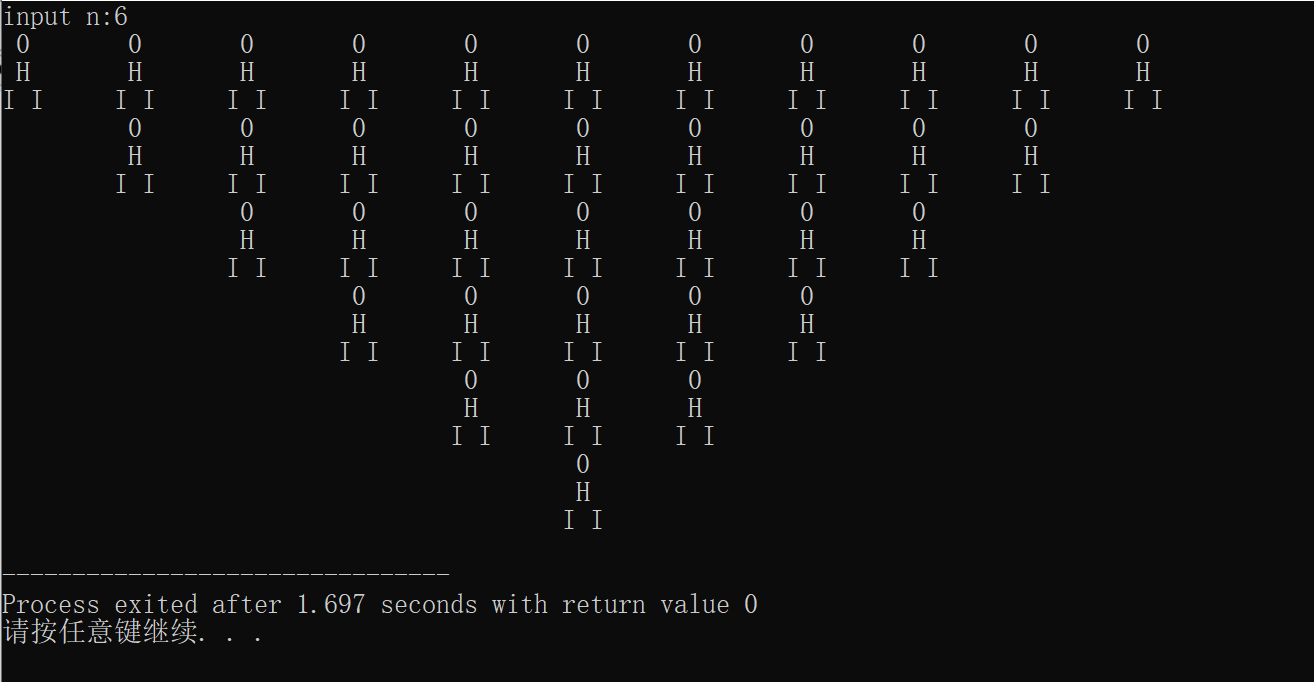 #include<stdio.h> int main(){ int i,n,j,x,y,m,g;//j为每行的个数 printf("input n:"); scanf("%d",&n); g=(n-1)*2+1; j=(n-1)*2+1; //定义第一行的数量 for(x=0;x<n;x++)//循环做n行 { for(m=0;m<(g-j)/2;m++){ printf("\t"); } for(i=0;i<j;i++){ printf(" 0\t"); }//每行的头 for(m=0;m<(g-j)/2;m++){ printf("\t"); } printf("\n"); for(m=0;m<(g-j)/2;m++){ printf("\t"); } for(i=0;i<j;i++){ printf(" H\t"); }//身体 for(m=0;m<(g-j)/2;m++){ printf("\t"); } printf("\n"); for(m=0;m<(g-j)/2;m++){ printf("\t"); } for(i=0;i<j;i++){ printf("I I\t") ; }//腿子 for(m=0;m<(g-j)/2;m++){ printf("\t"); } printf("\n"); j--; j--; } return 0; }