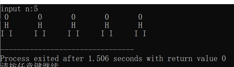 #include<stdio.h> int main(){ int i,n; printf("input n:"); scanf("%d",&n); for(i=0;i<n;i++){ printf(" 0\t"); } printf("\n"); for(i=0;i<n;i++){ printf(" H\t"); } printf("\n"); for(i=0;i<n;i++){ printf("I I\t") ; } printf("\n"); return 0; }