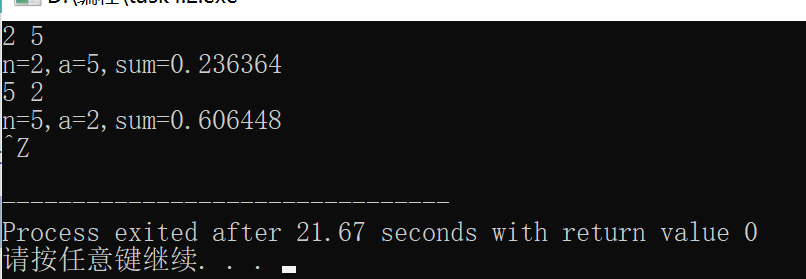 #include<stdio.h> int main() { int n,a,top,bottom; float sum; while(scanf("%d %d",&n,&a) !=EOF) { sum=0; bottom=a; for(top=1;top<=n;top++) { sum=sum+(float)top/bottom; bottom=bottom*10+a; } printf("n=%d,a=%d,sum=%f\n",n,a,sum); } return 0; }