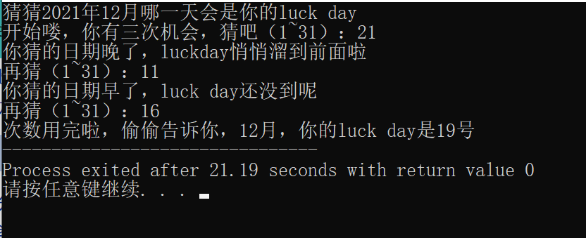 #include<stdio.h> #include<stdlib.h> #include<time.h> int main() { int x,y,n; n=1; srand(time(0)); x=rand()%30+1; printf("猜猜2021年12月哪一天会是你的luck day\n开始喽,你有三次机会,猜吧(1~31):"); scanf("%d",&y); getchar(); while(n<3){ if(y<x) { printf("你猜的日期早了,luck day还没到呢\n"); } else if(y>x) { printf("你猜的日期晚了,luckday悄悄溜到前面啦\n"); } else{ printf("你猜中啦!恭喜~\n"); break; } printf("再猜(1~31):"); scanf("%d",&y); getchar(); n++; } if(y!=x){ printf("次数用完啦,偷偷告诉你,12月,你的luck day是%d号",x); } return 0; }