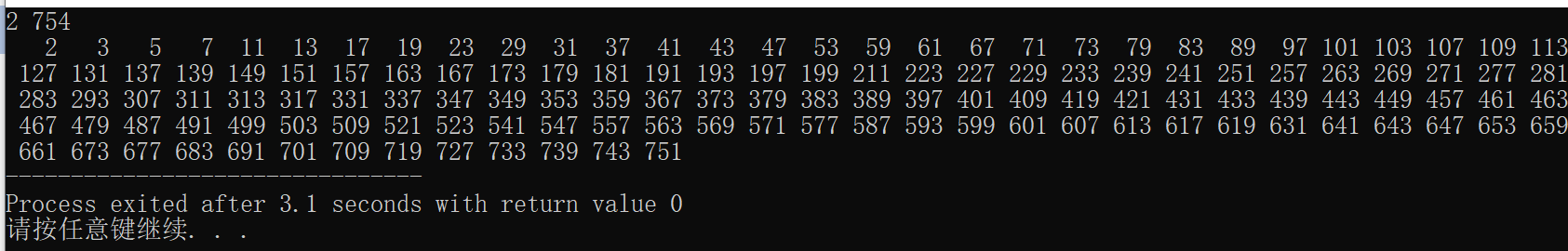 int fun(int n,int m,int bb[N]) { int i,j,k=0,flag; for(j=n;j<=m;j++) { if(j==1) bb[k++]=j; for(i=2;i<j;i++) if(j%i==0){ flag=0; break; } if(i==j) bb[k++]=j; } return k; } int main(){ int n=0,m=0,i,k,bb[N]; scanf("%d",&n); scanf("%d",&m); for(i=0;i<m-n;i++) bb[i]=0; k=fun(n,m,bb); for(i=0;i<k;i++) printf("%4d",bb[i]); return 0; }