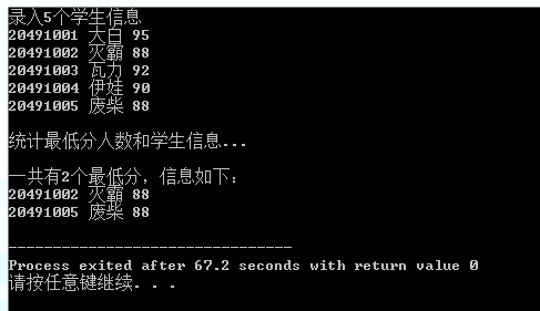 #include<stdio.h> #define N 5 typedef struct student { long no; char name[20]; int score; }STU; void input(STU s[],int n) ; int findminlist(STU s[],STU t[],int n); void output(STU s[],int n); int main(){ STU stu[N],minlist[N]; int count; printf("录入%d个学生信息\n",N); input(stu,N); printf("\n统计最低分人数和学生信息...\n"); count=findminlist(stu,minlist,N); printf("\n一共有%d个最低分,信息如下:\n",count); output(minlist,count); return 0; } void input(STU s[],int n){ int i; for(i=0;i<n;i++){ scanf("%ld %s %d",&s[i].no,s[i].name,&s[i].score); } } void output(STU s[],int n){ int i; for(i=0;i<n;i++){ printf("%ld %s %d\n",s[i].no,s[i].name,s[i].score); } } int findminlist(STU s[],STU t[],int n){ int i,number,min=s[0].score,k=0; for(i=1;i<n;i++){ if(s[i].score<min) min=s[i].score; } for(i=0;i<n;i++){ if(s[i].score==min){ t[k++]=s[i]; } } return k; }