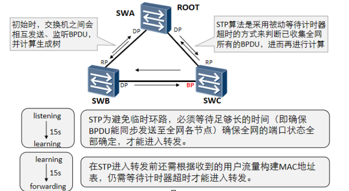 问题1.收敛慢 设备从初始化,到收敛完成,最少要经历30s的时间 .为了防止临时环路的出现,采用被动等待的计时器. STP的计算,必须要等待固定的时长20s