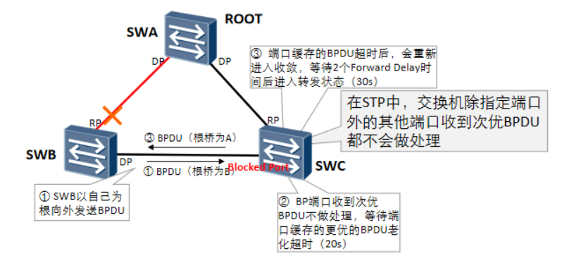 *SWB收到SWC的P消息后,发现P消息里虽然根桥和自己认可的一样,但是发送者的桥优先级比自己低(SWB>SWC),会不停的发送P消息。 以上状态在等待2个Forward Delay时间后,SWB端口为DP端口,处在Forwarding状态, SWC端口为AP端口,处在Discarding状态。