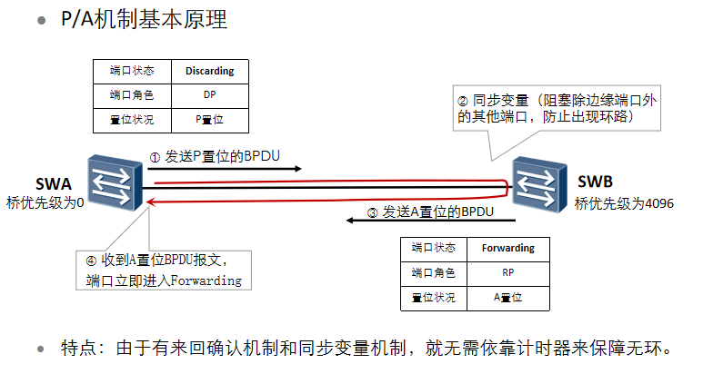 当一个接口接收到一个次等BPDU之后,马上把自身储存的(最优)BPDU返回给源端口,然后启动P/A机制,可以实现接口的秒级切换