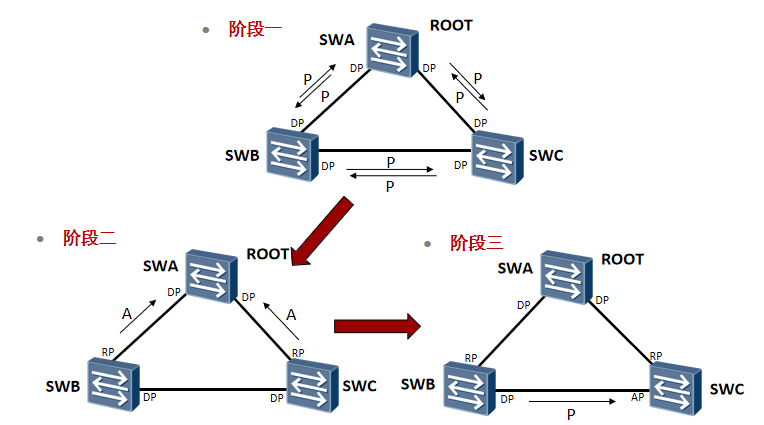 阶段二:交换机SWA收到SWB和SWC的P消息会置之不理,因为他的桥优先级最高。交换机SWB和SWC收到SWA的P消息后,由于认同SWA是最优的根桥,会根据P/A协商流程回复A消息,并把发送端口变成RP端口,同时接口处在Forwarding状态。(非根桥交换机配合根桥完成PA,进行STNC同步,把除RP端口外的所有端口(不包括边缘端口,阻塞端口),都阻塞。B,C向A发送A置为的BPDU)