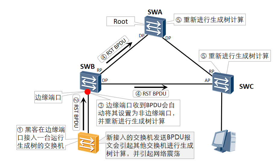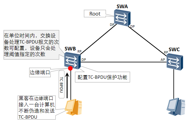 场景:黑客在边缘端口接入一台计算机不断伪造和发送TC-BPDU (对于边缘端口来说,不希望收到BPDU报文)