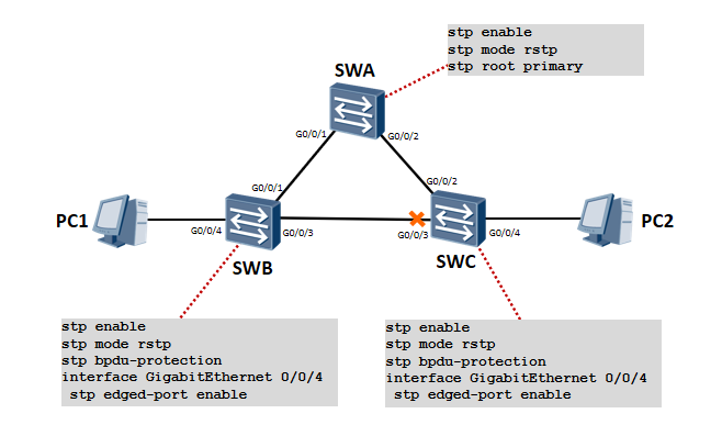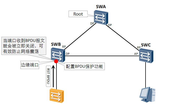 实现原理:配置BPDU保护功能后,如果边缘端口收到BPDU报文,边缘端口将会被立即关闭。