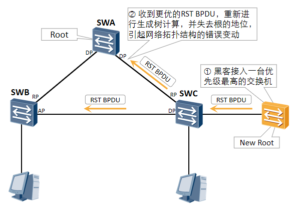 场景2.由于维护人员的错误配置或网络中的恶意攻击,网络中合法根桥有可能会收到优先级更高的RST BPDU