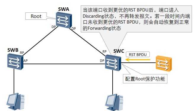 实现原理:一旦启用Root保护功能的指定端口收到优先级更高的RST BPDU时,端口状态将进入Discarding状态,不再转发报文。在经过一段时间,如果端口一直没有再收到优先级较高的RST BPDU,端口会自动恢复到正常的Forwarding状态。