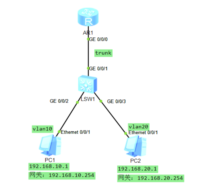 [SW-GigabitEthernet0/0/1]port trunk allow-pass vlan 10 20