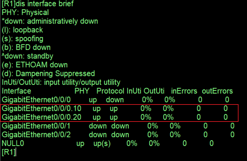 [R1-GigabitEthernet0/0/0.10]dot1q termination vid 10 # 在子接口上通过802.1q协议(具备dot1q的能力),关联相对应的vlan10