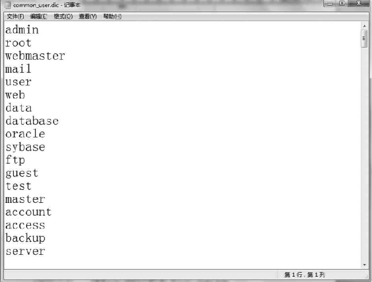 针对这些简单的网络服务认证,可以采用一种“暴力破解”的方法。这种方法的思路很简单,就是把所有可能的密码都尝试一遍,通常可以将这些密码保存为一个字典文件。