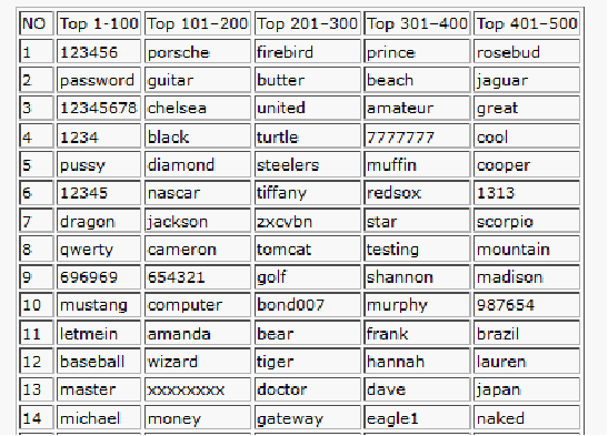 Lists the top 500 worst passwords of all time