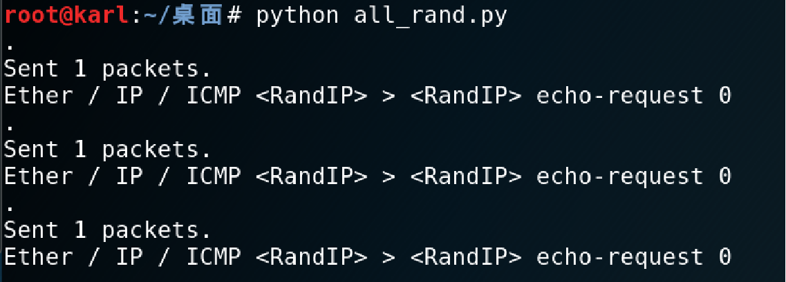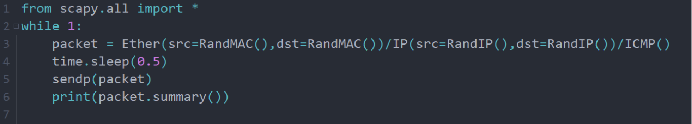 2)构造随机MAC和IP,scapy模块中的RandMAC()和RandIP()可以很方便地实现这一点,也可以生成固定网段IP,如 RandIP("192.168.1.*")。