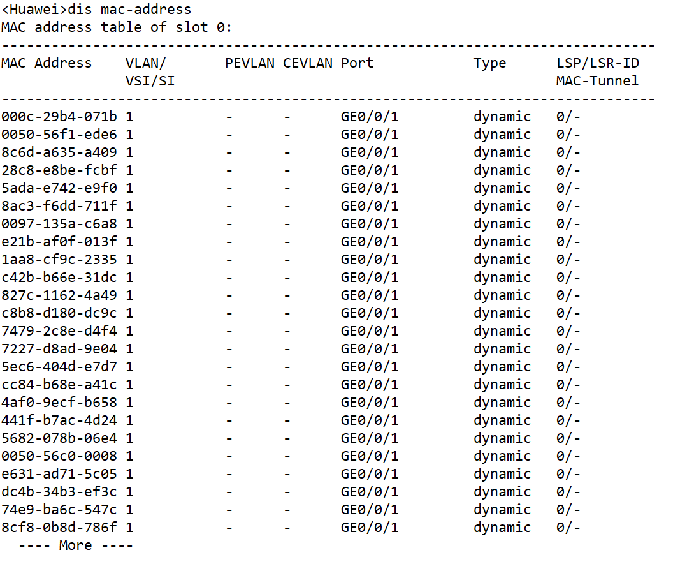 5.4 交换机在遭到攻击之后,内部的CAM表很快就被填满。 交换机退化成集线器,会将收到的数据包全部广播出去,从而无法正常向局域网提供转发功能,实现的过程很简单。